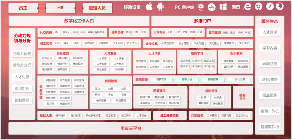 用友人力資本管理融合了先進的管理理念和實踐,為國內(nèi)外大中型集團企業(yè)及各類組織提供基于國際化架構(gòu)下的全生命周期人力資本管理解決方案,包括面向多組織集團的人力資源集團管控、核心人力資源管理、基于流程的精細化勞動力管理、以持續(xù)績效、人才發(fā)展、組織發(fā)展為核心的人才管理。