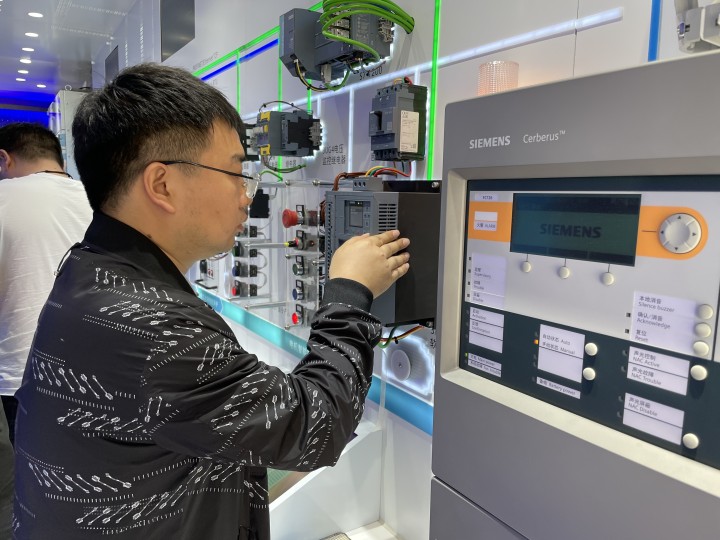 一輛集裝箱大卡車別出心裁地裝飾成移動(dòng)的“會(huì)展中心”,印有西門子標(biāo)志的旗幟迎風(fēng)飄揚(yáng),車身“共創(chuàng)智能基礎(chǔ)設(shè)施新生態(tài)”幾個(gè)大字格外醒目。
