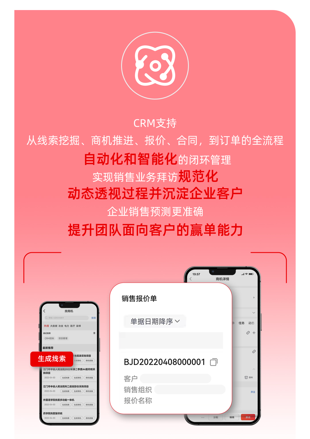 YonSuite全新的客戶關(guān)系管理服務(wù)支持從線索挖掘、商機(jī)推進(jìn)、報(bào)價(jià)、合同、訂單的全流程自動(dòng)化智能化的閉環(huán)管理,讓銷售管理變得更為簡單。同時(shí),還能動(dòng)態(tài)透視過程并沉淀企業(yè)客戶,企業(yè)銷售預(yù)測更準(zhǔn)確,從此贏單不再難。