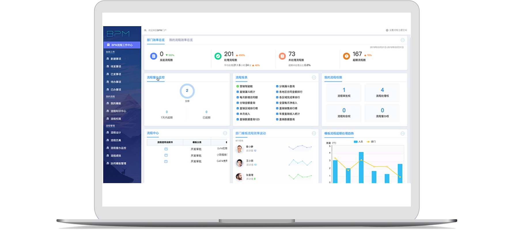 支持對協(xié)同工作的處理,流程處理的監(jiān)督,以及流程數(shù)據(jù)總覽,為組織構(gòu)建流程管理體系。