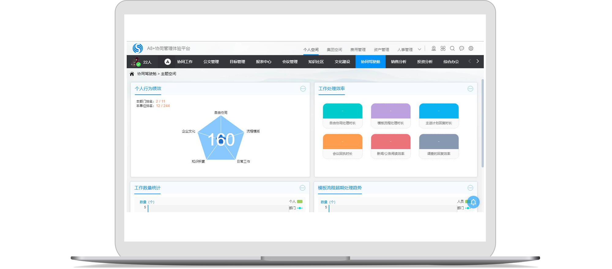 支持呈現(xiàn)個人行為績效、工作處理效率、協(xié)同360、模板流程超期處理趨勢。支持呈現(xiàn)數(shù)據(jù)總覽,流程效率,節(jié)點效率,部門效率,人員效率等不同維度的流程效率圖表。支持呈現(xiàn)組織行為績效分,可對部門、人員等不同層級進行行為績效排名。支持呈現(xiàn)存儲空間統(tǒng)計,在線時間分析,在線人數(shù)趨勢,協(xié)同立方。