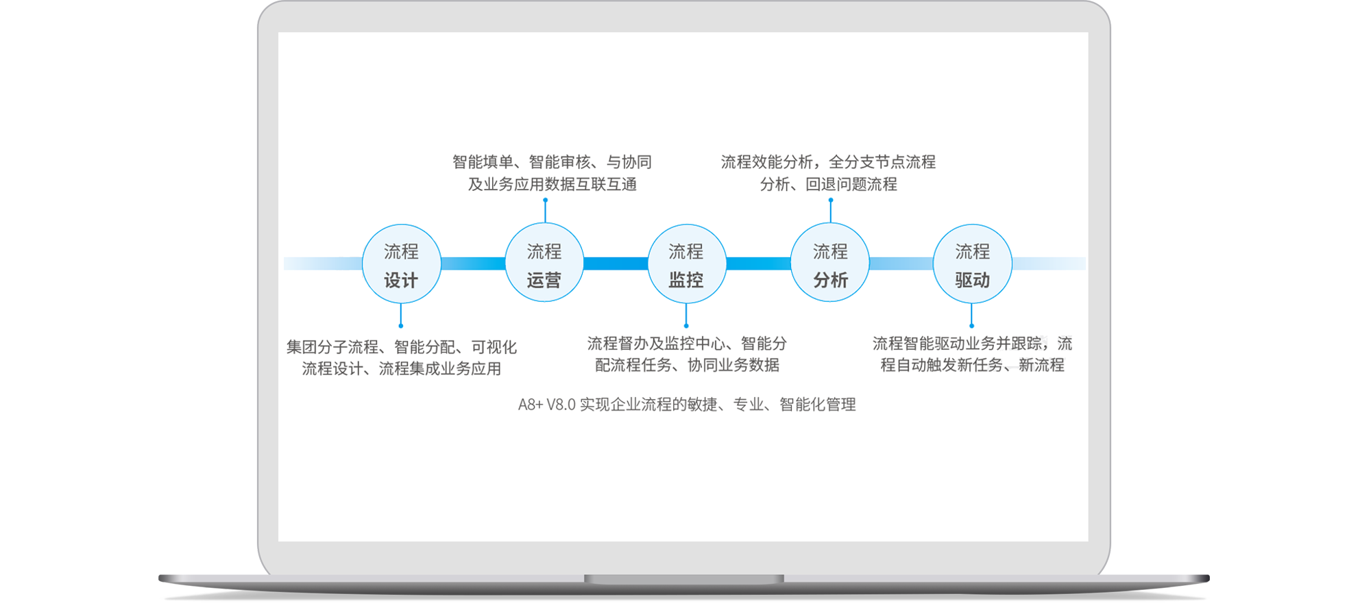 程作為不同業(yè)務(wù)節(jié)點、組織角色、數(shù)據(jù)信息銜接的紐帶,是企業(yè)經(jīng)營管理的“血脈”,無論是生產(chǎn)經(jīng)營還是業(yè)務(wù)管控,都是通過一個個或業(yè)務(wù)、或項目、或協(xié)作的過程來實現(xiàn)。致遠互聯(lián)A8+ V8.0 在數(shù)字化時代重新釋義BPM,將企業(yè)級業(yè)務(wù)流程從設(shè)計、運營、監(jiān)控、分析到自動進行任務(wù)延展的全過程進行統(tǒng)一管理,強化大型企業(yè)流程管理模式的適應(yīng)性,同時探索AI 技術(shù)與流程的結(jié)合,幫助企業(yè)實現(xiàn)敏捷流程、智能流程的優(yōu)化管理。