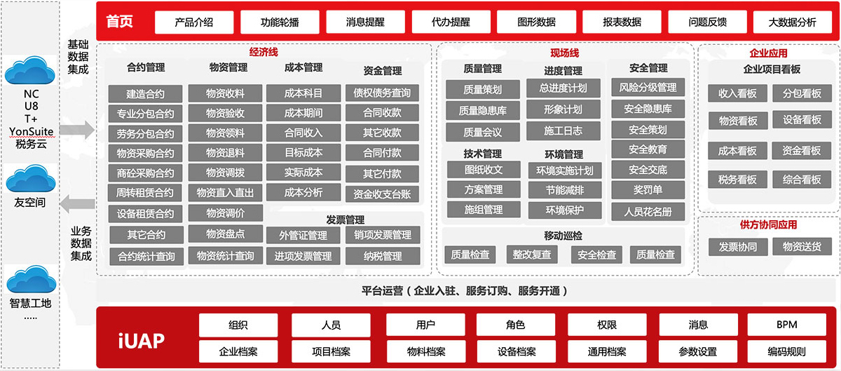 項目履約過程中合約管控、收支平衡、成本核算、四流合一、業(yè)務協(xié)同、現(xiàn)場巡檢、風險控制等管理難點,現(xiàn)已融合用友NC、YonSuite、U8、
