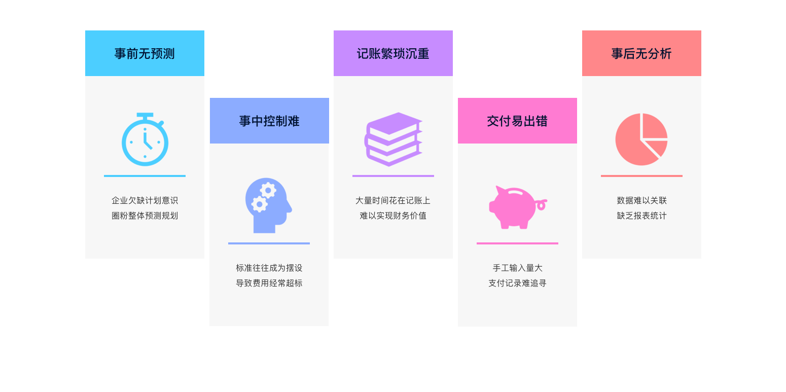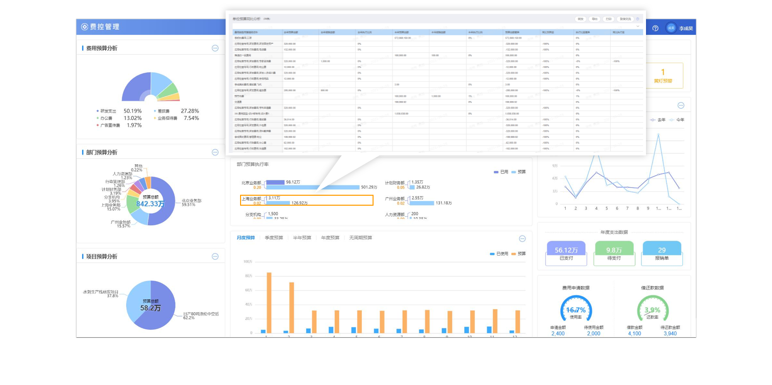 事前計劃:制定政策和計劃時可全方位的查閱歷年的詳細費控數(shù)據(jù); 事中控制:準確及時了解各部門、項目預算使用情況; 事后分析:得到更及時、完整和精確的統(tǒng)計分析報告。