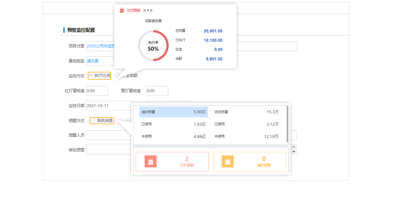 預算預警可以指定在某個時間段內(nèi),對預算方案下的某一費用類型自定義安全余額或執(zhí)行比例,在業(yè)務審批過程中達到這個安全邊界值時,就會有提示信息,并且在預警看板中也會顯示出來。 預警的程度分為紅燈預警和黃燈預警,可以分別定義不同的安全余額或執(zhí)行比例。