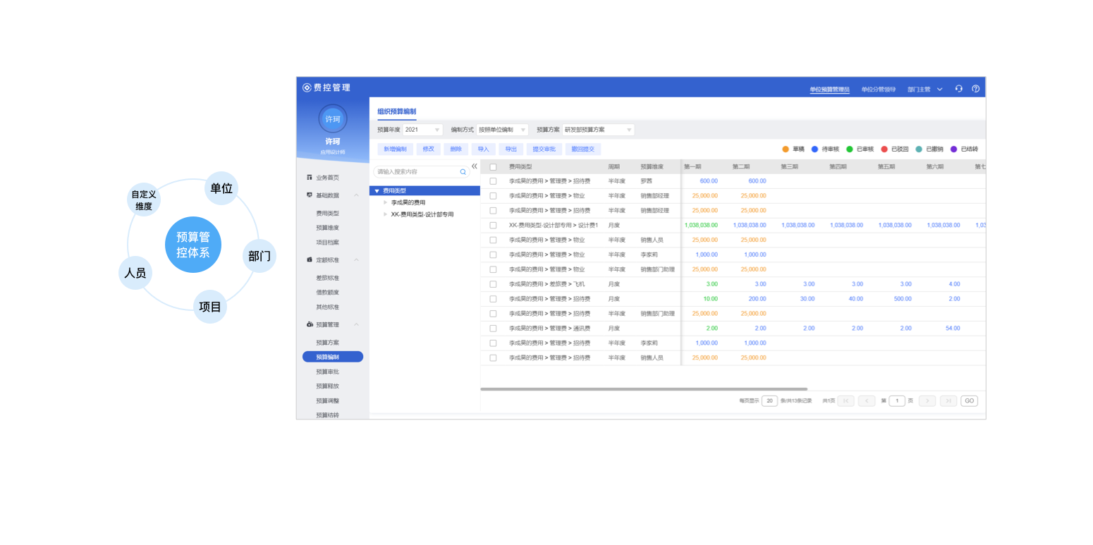 系統(tǒng)提供兩種預算編制方法,一是線上直接編制,二是線下編制EXCEL后導入;同時提供線上預算編制模板,以規(guī)范各單位、各部門預算預算編制的準確性,確保預算控制行之有效,細化和深化了對費用管理。系統(tǒng)支持多種預算控制策略的組合,支持用戶自定義預算維度,支撐不同組織的預算管理體系;預算金額支持金額按期自動均分和手動拆解。
