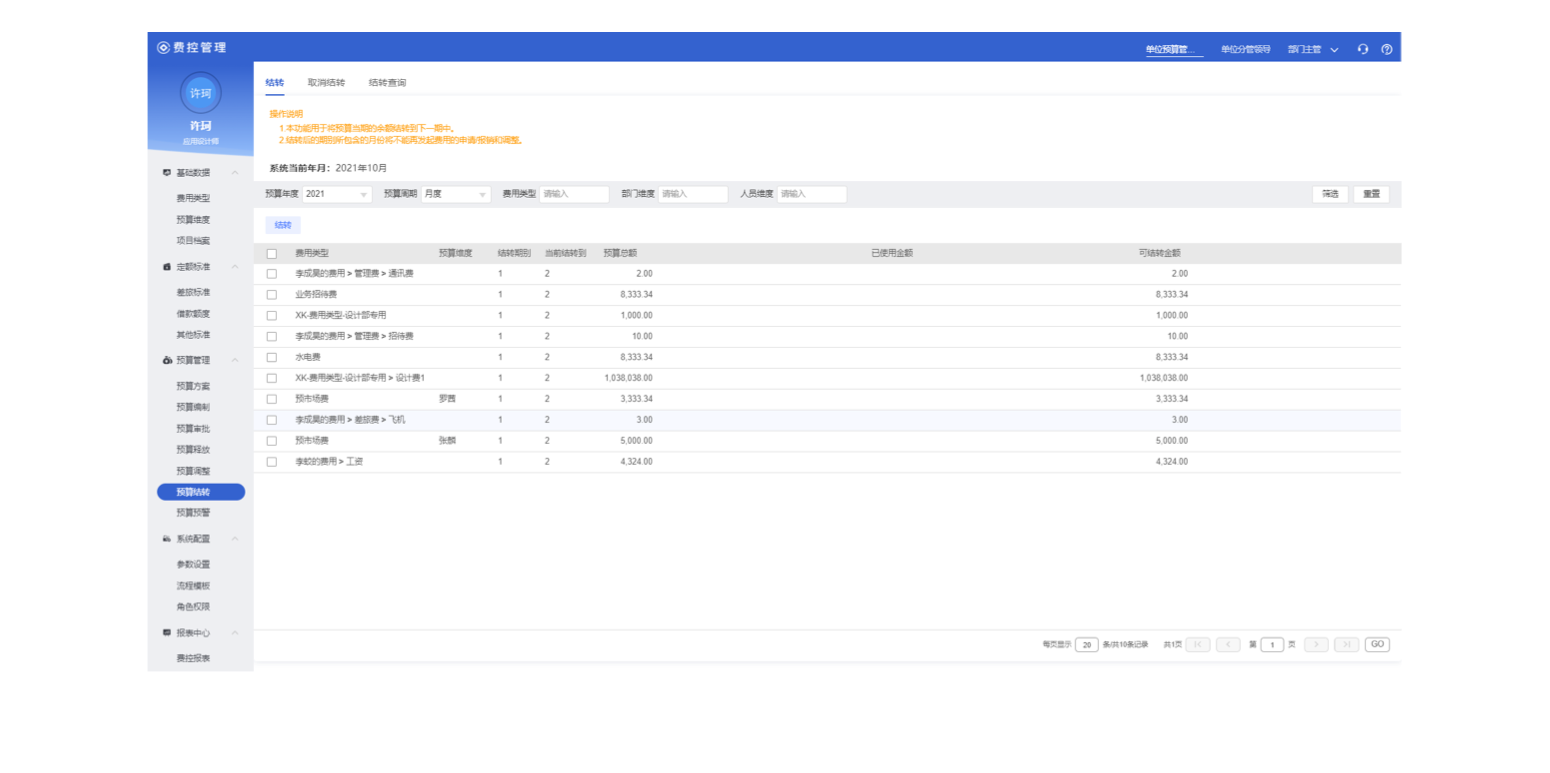 支持企事業(yè)單位按不同費用類型,在當前預算額沒有花完時,在指定的期末可以將可用余額結(jié)轉(zhuǎn)到下一期,用于在預算期間控制使用情況,強化預算控制。