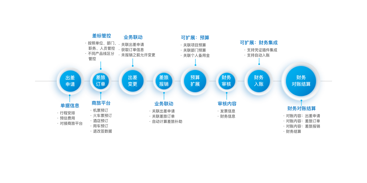 商旅業(yè)務子模塊采用出差申請與報銷業(yè)務與商旅平臺【差旅天下】深度整合,讓員工操作無感自動化切換,實現(xiàn)從出差申請、商旅預訂、行程退改簽、差旅費報銷、商旅對賬等功能,實現(xiàn)員工出差業(yè)務全程電子化、無現(xiàn)金交易,自動化控制不同職級人員差旅標準的有效執(zhí)行,提高員工滿意度,降低審計內(nèi)控風險。