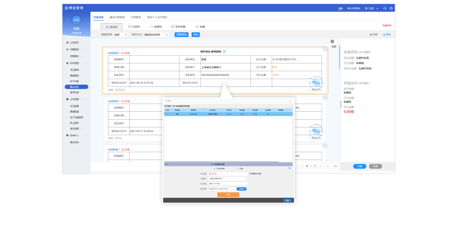 系統(tǒng)預置銀企直連模塊,支持一鍵快速支付和付款池批量支付兩種支付方式,以便于企事業(yè)單位對資金的合理使用;