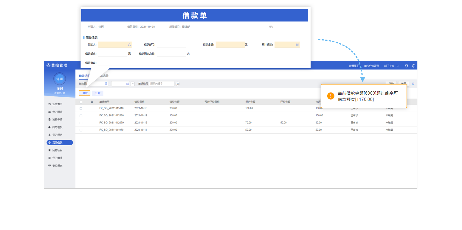 系統(tǒng)預置員工/部門借款信用管理模型(如借款次數(shù)、借款總額、借款沖抵、部門累計等,更好地支持企事業(yè)單位對員工借款的管理,直觀清晰地了解員工歷史借款、報銷、還款情況,并可及時通知員工報銷或還款,減少壞賬損失。